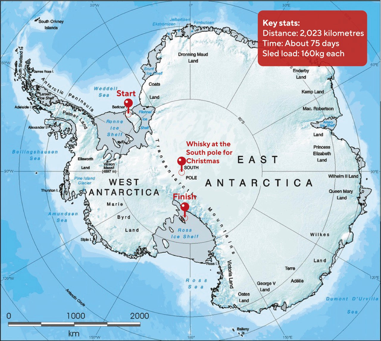 Their journey starts on the coast of the Weddell Sea, where they make their way to the South Pole. From the South Pole, Gareth and Andrew will head to the base of the Reedy Glacier on the Ross Ice Shelf.
