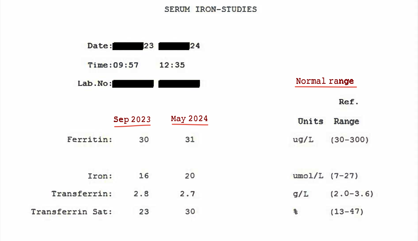 As you can see, this person is on the bottom end of the normal range for ferritin (i.e. their iron stores are low).